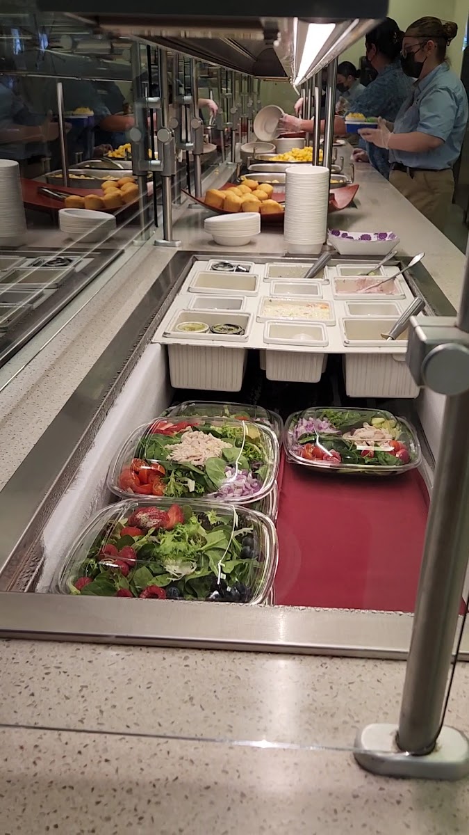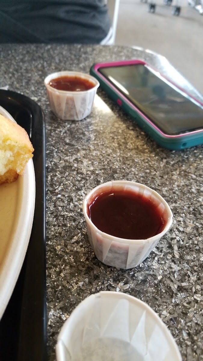 Lines were short and quick at the hour I went. Meatballs had boysenberry bbq sauce…mild and good. Mac&cheese wasn’t very creamy. Cornbread was soft and fluffy. Numerous drink options including a Freestyle machine. Wish I had found this place earlier on my trip.