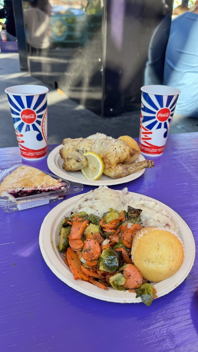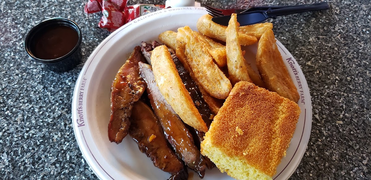 The Tri-tip was well seasoned. The meatballs were a little dense but were full of flavor. The mashed potatoes had a good texture. The seasoned veggies were well cooked too. The spicy bbq had a really good kick! The boysenberry bbq sauce was not as sweet as I was expecting and was yummy! The mac and cheese was delicious. The cornbread was dry but had pretty good flavor. For being a cater style restaurant most of the food was pretty good!